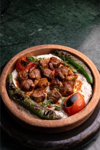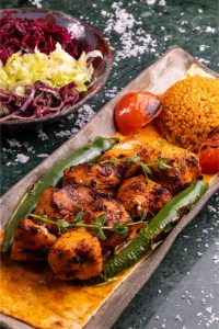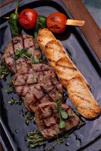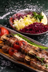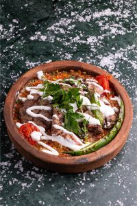 (Veal tenderloin marinated with milk, onion, tomato paste and olive oil, grilled green pepper & cherry tomato, mushroom, bulgur, seasonal salad, lavash bread) /1,7