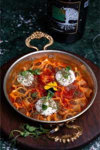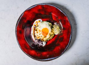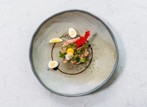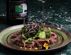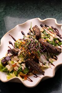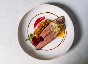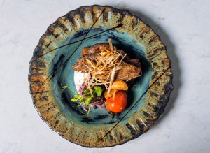 (Muschi de vita, oua de prepelita, ulei de masline extra virgin, mustar Dijon, ceapa echalot, capere, patrunjel, galbenus de ou, pastrama crocanta, lavas)