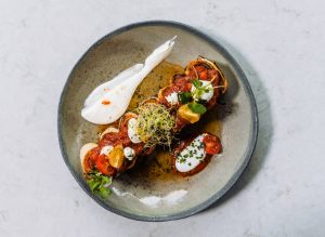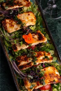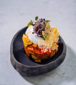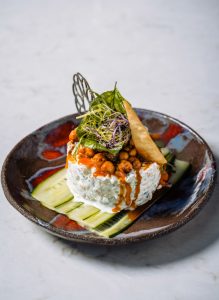 (Rosii, castravete, ardei gras, ceapa verde, menta proaspata, patrunjel, cirese, sos bostana – suc de visine, ulei de masline, suc de lamaie, sos de rodie, menta uscata, sumac si piper negru)