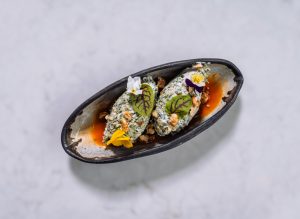 (Frunze de vita de vie, orez, ceapa, muguri de pin, ulei de masline, lamaie, patrunjel, marar, piper negru, sumac, iaurt) (Grape leaves, rice, onion, pine nuts, olive oil, lemon, parsley, dill, black pepper, sumac, yoghurt) / 7,8/3E