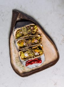 (Taco umplut cu intestine de miel si oaie picante, pasta de avocado, muraturi de casa, condimente)