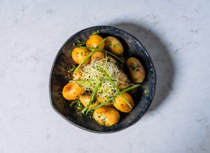 (Vinete la gratar, iaurt strecurat, usturoi, pasta de susan alb, nuca, suc de lamaie si ulei de masline)