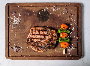 (Muschi de vitel marinat in lapte, ceapa, pasta de tomate si ulei de masline, ardei verde la gratar si rosii cherry, ciuperci, bulgur, salata de sezon, paine lavas)