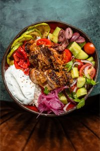 (Roșii cherry, castraveți, măsline, orez, pulpă de pui, ceapă roșie, ardei gras copt, iceberg, dovlecel, pătrunjel, semințe de floarea soarelui, iaurt, mărar)