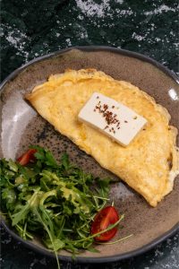 (Brânză asortata, gem, miere, unt, avocado, castraveți, roșii, verdeață, ardei, tipuri de măsline, salată cu ou fiert, aluat prăjit, pastă picanta, coș de pâine)