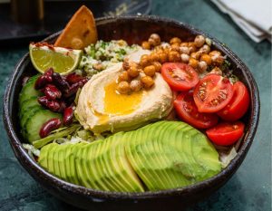 (Humus, castravete, fasole roșie, roșii cherry, tabbouleh, iceberg, lime, năut, pătrunjel, avocado, tahini, lămâie)