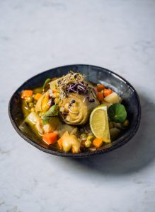 (Inima de anghinare, ulei de masline, ceapa, morcov, mazare, suc de lamaie si portocale, marar) (Artichoke heart, olive oil, onion, carrot, pea, lemon & orange juice, dill)